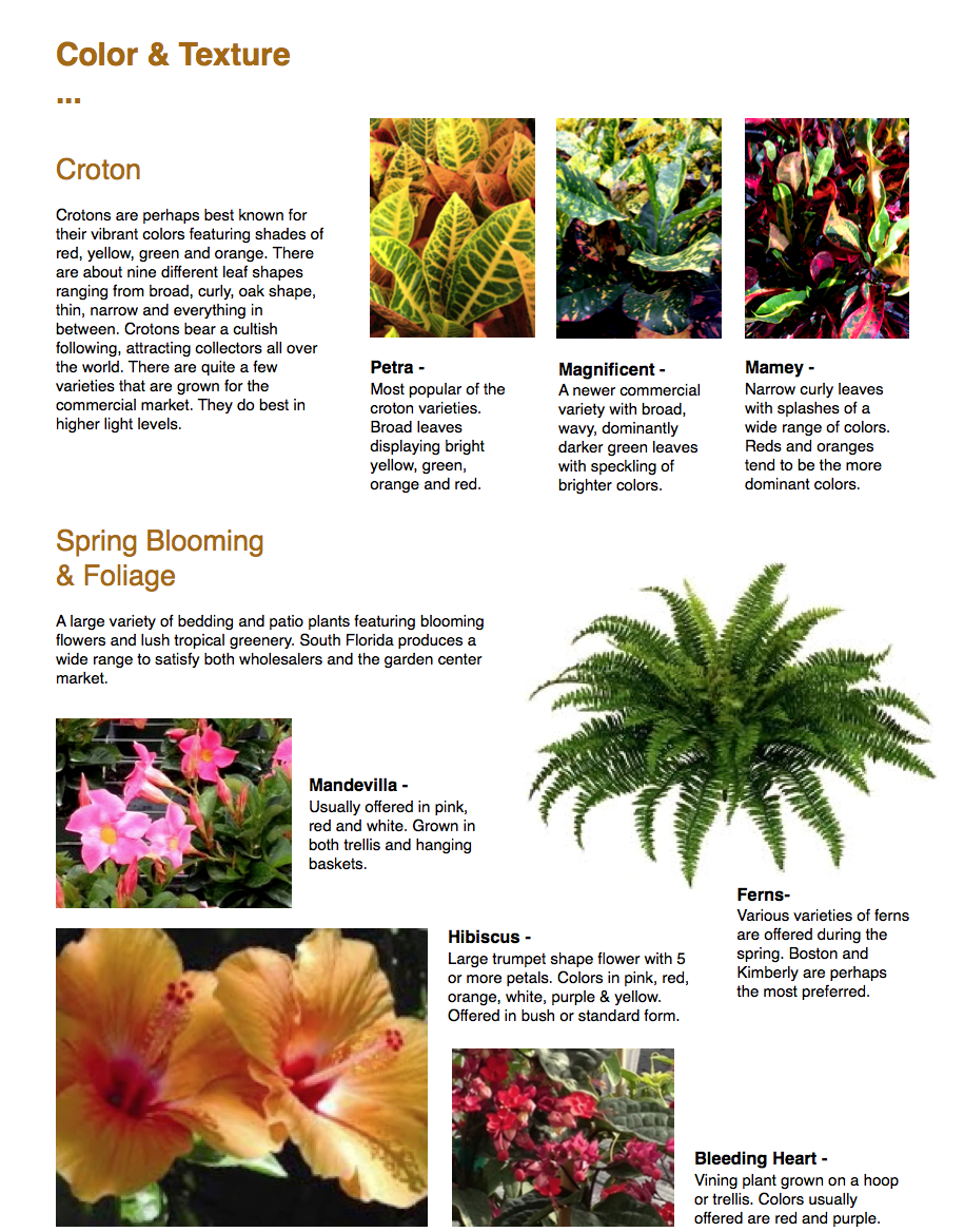 A large variety of bedding and patio plants featuring blooming flowers and lush tropical greenery. South Florida produces a wide range to satisfy both wholesalers and the garden center market.